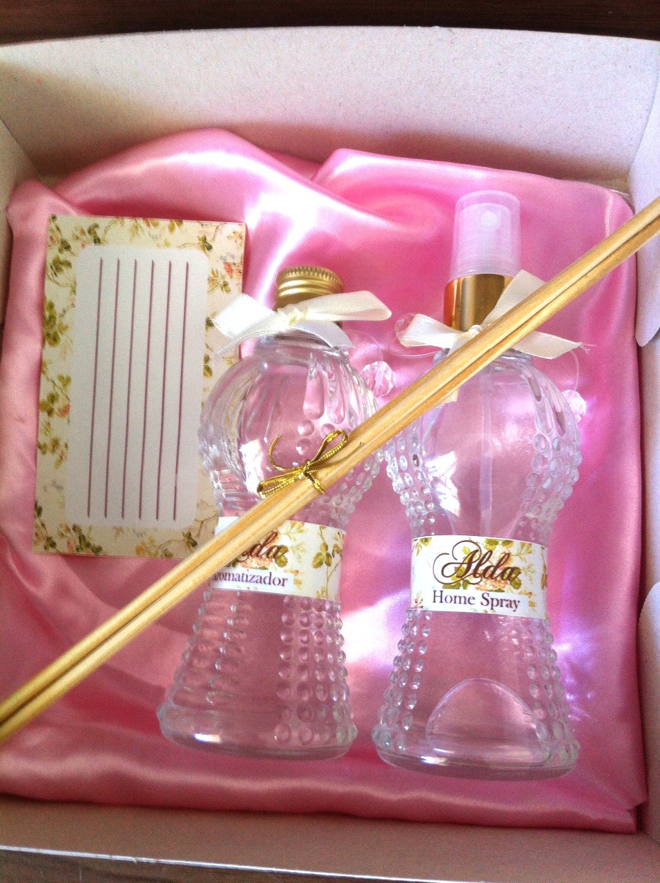 Difusor de varetas e home spray com fragrância lavanda em vidrinhos "cinturinha", tudo personalizado!